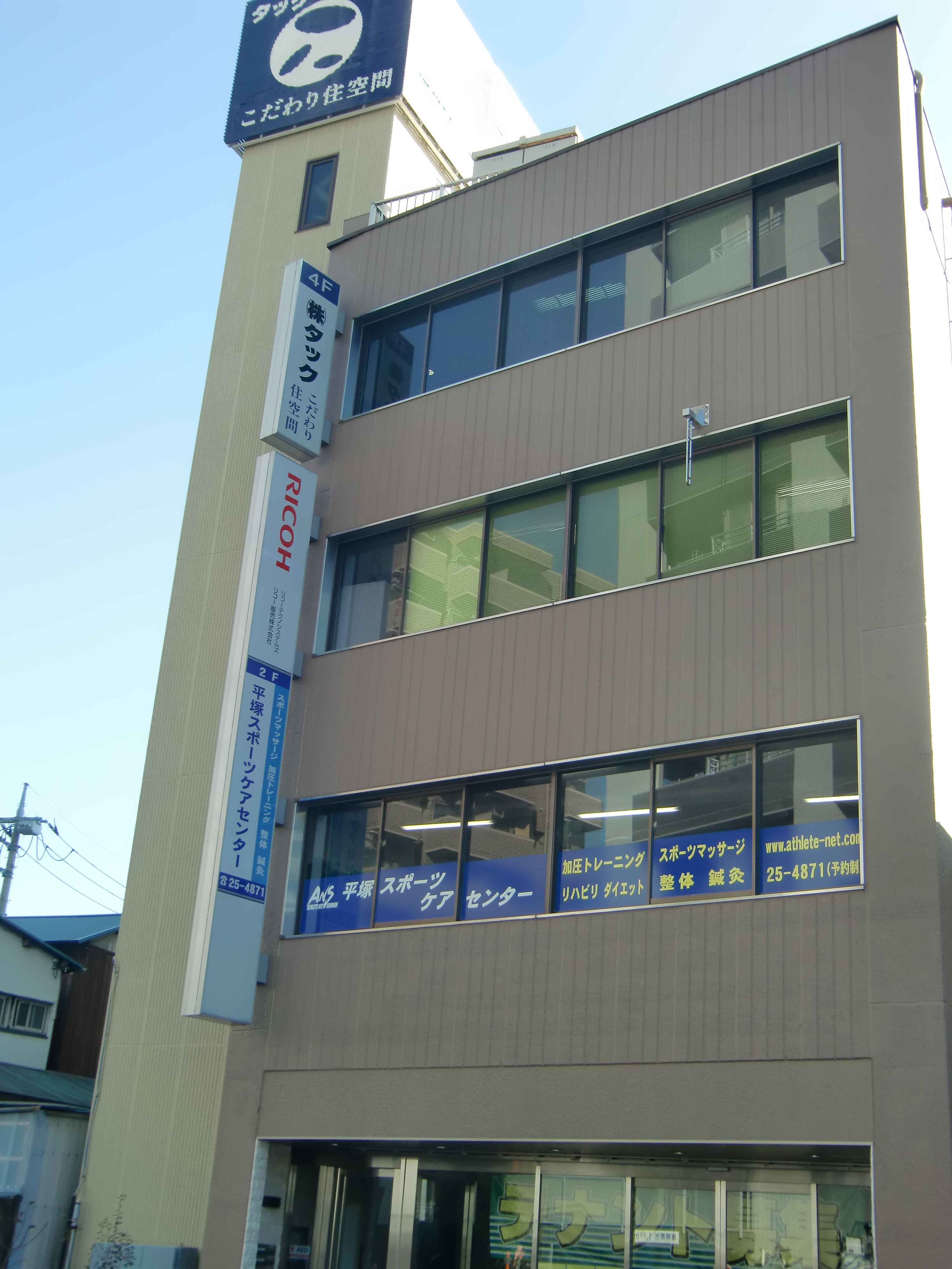 2階に「平塚スポーツケアセンター」の看板が見えます。